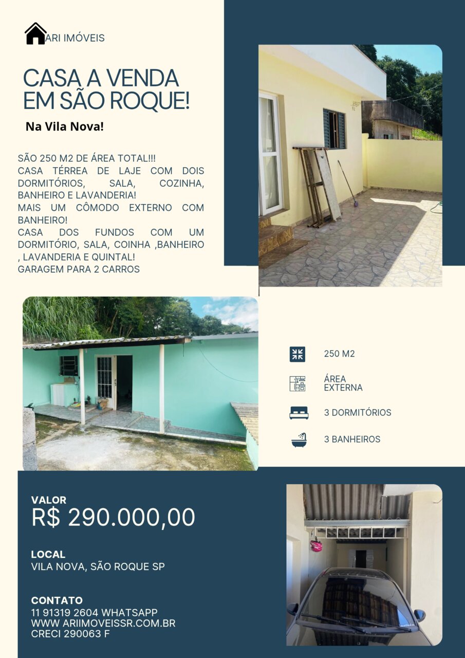 Casa a venda em São Roque! * Na vila Nova! Bairro próximo ao centro! Com acesso pela Raposo e pela castelo branco! * São 250 M2 de área total! *Casa com 2 dormitórios, sala, cozinha, banheiro e lavanderia! Mais um cômodo externo com banheiro! *Casa dos fundos com um dormitório, sala, cozinha, banheiro e quintal! *Garagem para 2 carros! *Local próximo a mercados, escolas, ponto de ônibus... R$ 290.000,00 ( Não dá financiamento)