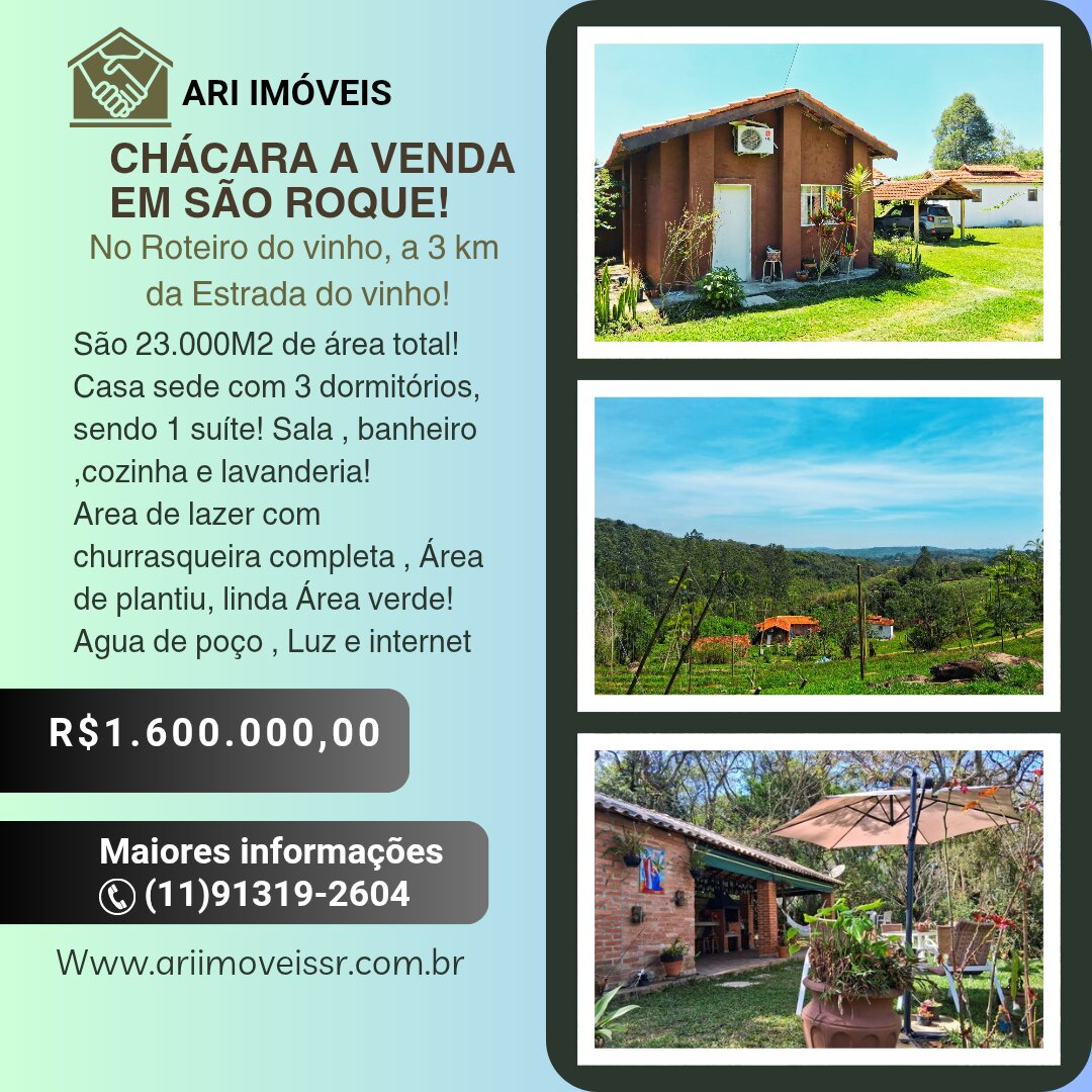CHÁCARA A VENDA EM SÃO ROQUE!!! 23.641 metros quadrados. Casa de 105 metros. quadrados. 3 quartos. 2 banheiros. Sendo 1 suíte. Galpão de 8m X 4m. Casa de caseiro. (Precisa reforma) Poço artesiano. 3 poços caipiras. Churrasqueira completa com banheiro. Área de plantiu com equipamentos de irrigação completo! Chácara inteira telada. Internet. TV a cabo. Ar condicionado.